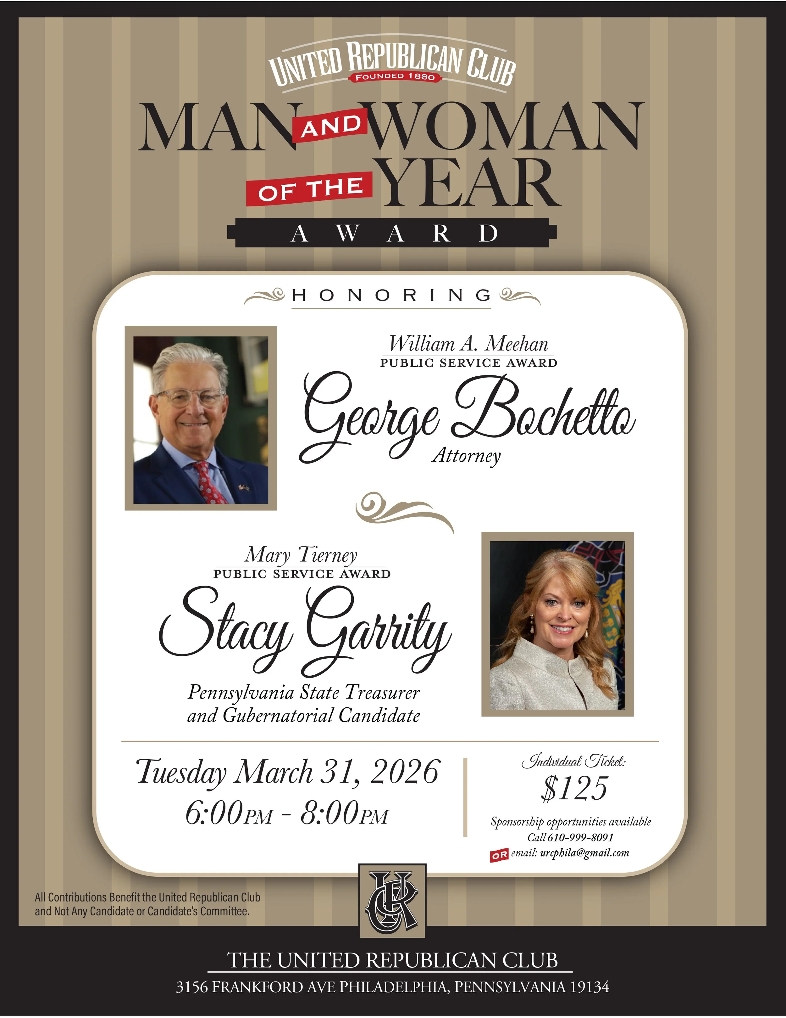 Join us on Wednesday April 23, 2025 for The URC Man and Woman of the Year Award. This year we are honoring Seth Bluestein-Philadelphia City Commissioner and Christine Flowers-Lawyer, Columnist, TV and Radio Personality.